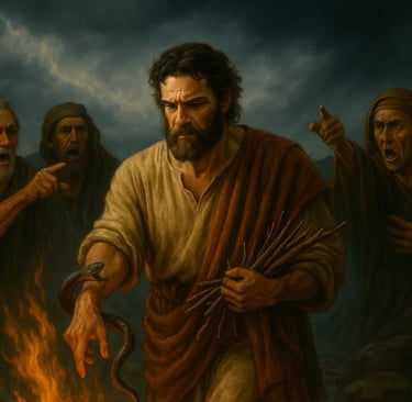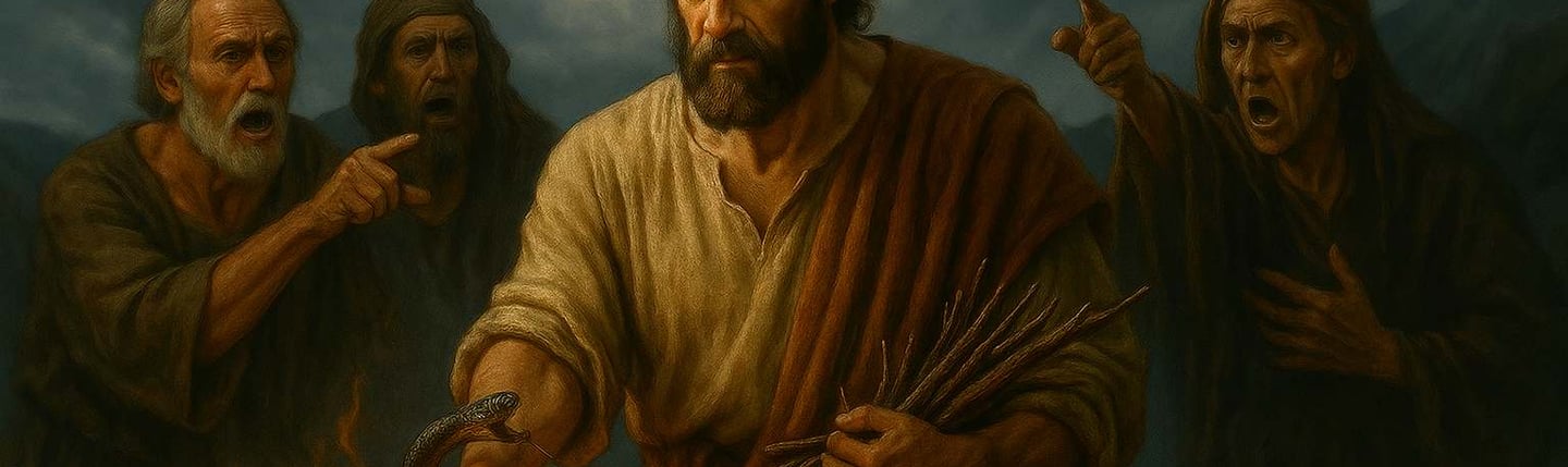 Ao chegarem à ilha de Malta, o povo local recebe Paulo e seus companheiros com bondade. Está frio e chuvoso, então acendem uma fogueira. Paulo, mesmo sendo prisioneiro, vai buscar gravetos para manter o fogo aceso. E é nesse momento que uma cobra venenosa morde sua mão.
